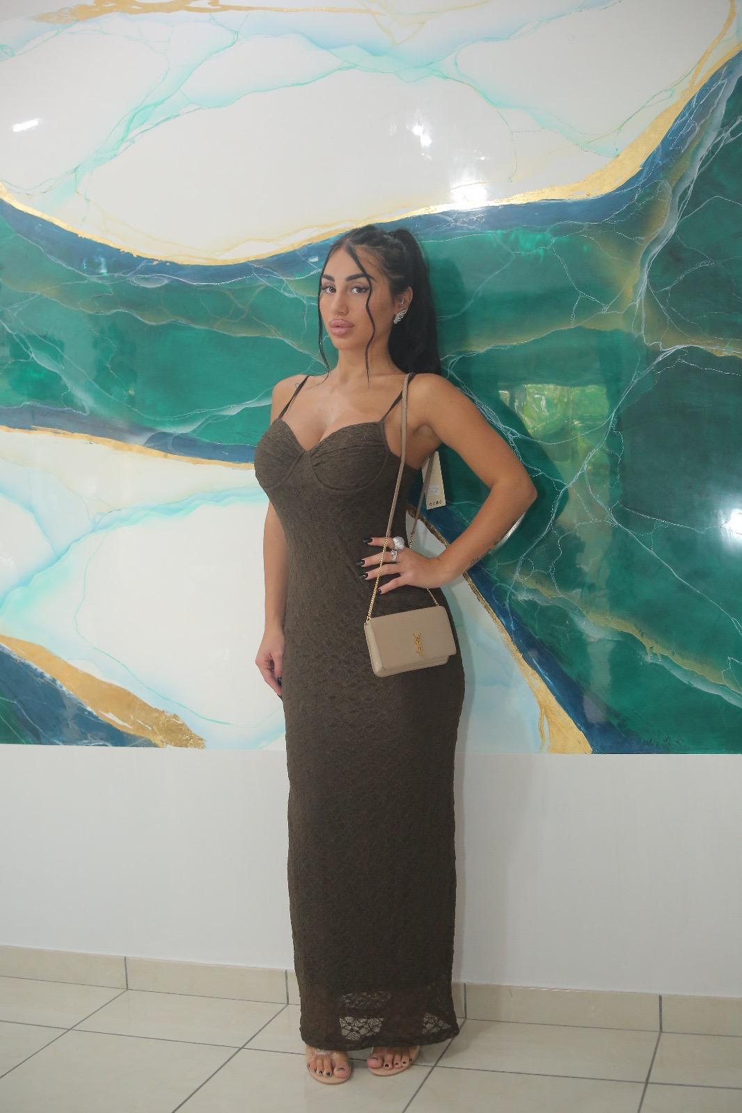 Il vestito "cacao di Mezzanotte" è un capolavoro di sensualità e raffinatezza, pensato per chi vuole distinguersi con classe. Realizzato in un delicato pizzo marrone scuro, leggermente trasparente, si appoggia al corpo come una seconda pelle, esaltando le curve in modo elegante e deciso. Le coppe strutturate e le spalline sottili conferiscono un tocco di femminilità senza tempo, mentre la texture del pizzo aggiunge profondità e fascino al look.