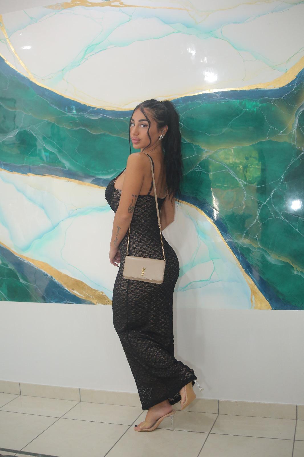 Il vestito "Notte di Velluto Nero" è una creazione seducente e sofisticata, pensata per brillare nelle serate più esclusive. Realizzato in un raffinato pizzo nero con trasparenze strategiche, il modello aderente esalta le curve con eleganza e carattere. Le spalline sottili e lo scollo strutturato aggiungono un tocco di femminilità, mentre il taglio lungo slancia la figura. Perfetto per una serata di gala o un evento glamour, questo abito è un inno alla sensualità moderna.